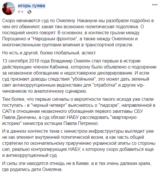 13:49  Министр легко отделался. Понял он намек или нет - покажет время. О том, кто именно и на что намекают Владимиру Омеляну, пишет в Facebook главный редактор "Страны" Игорь Гужва: