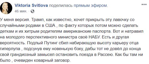 "У меня версия. Трамп, как известно, хочет прикрыть эту лавочку со случайными родами в США , по факту которых потом можно сделать деткам и их хитрым родителям американские паспорта. Вот и натравил на молодого перспективного министра своё НАБУ. Есть и другая вероятность. Подлый Путинг сбил набирающую высоту карьеру отца гиперлупа , подсунув ему новенькую бэху, дабы тот не довёл до конца свой грандиозный замысел остановить поезда в Рассею. Как бы там ни было, очевиден коварный заговор", - пишет журналистка Виктория Светлова.