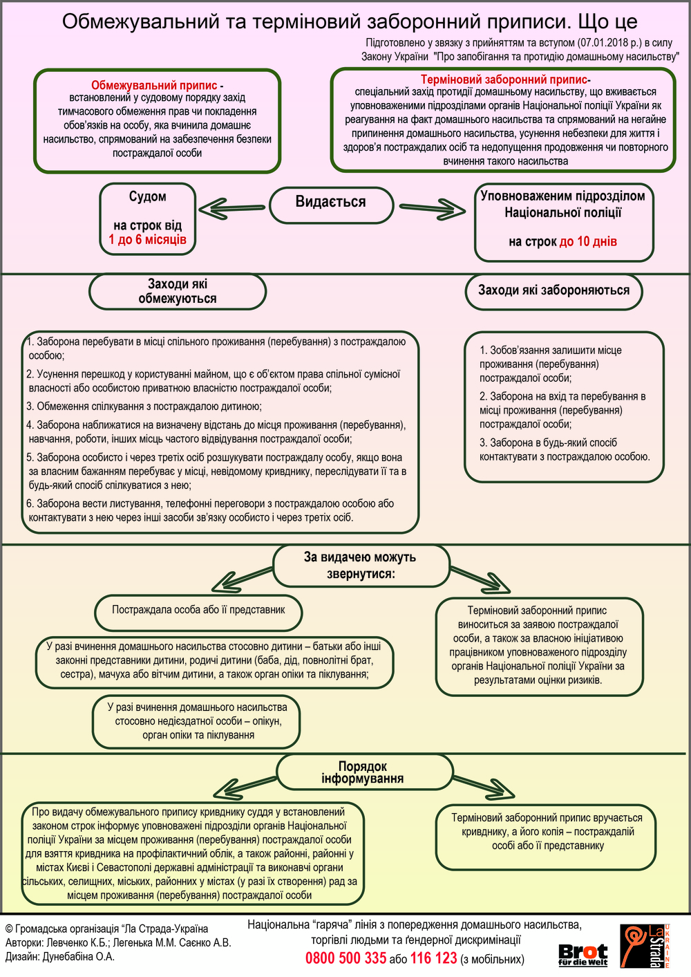 Законом предусматривается, что срочное запрещающее предписание выносится сотрудниками Нацполиции, если есть непосредственная угроза жизни или здоровью пострадавшего. Оно должно быть направлено на немедленное прекращение побоев, устранение опасности для жизни и здоровья пострадавшего, недопущение дальнейшего применения силы и новых рукоприкладств. Вплоть до запрета вероятному агрессору на нахождение на одной территории с жертвой на определенный период.