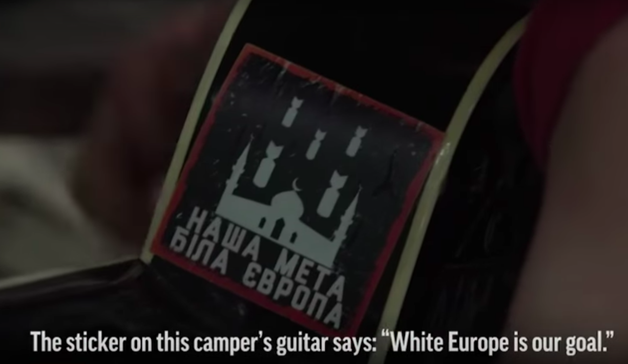 У одного из воспитанников лагеря на гитаре, под которую он поет "Лента за лентою патроны подавай", наклейка с мечетью, в которую летят бомбы и надписью "Наша мета - біла Європа".