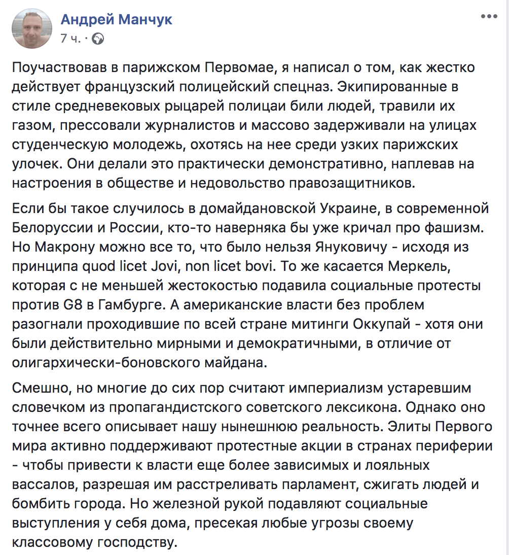 Если бы такое случилось в домайдановской Украине, в современной Белоруссии и России, кто-то наверняка бы уже кричал про фашизм. Но Макрону можно все то, что было нельзя Януковичу - исходя из принципа quod licet Jovi, non licet bovi. То же касается Меркель, которая с не меньшей жестокостью подавила социальные протесты против G8 в Гамбурге. А американские власти без проблем разогнали проходившие по всей стране митинги Оккупай - хотя они были действительно мирными и демократичными, в отличие от олигархически-боновского майдана.