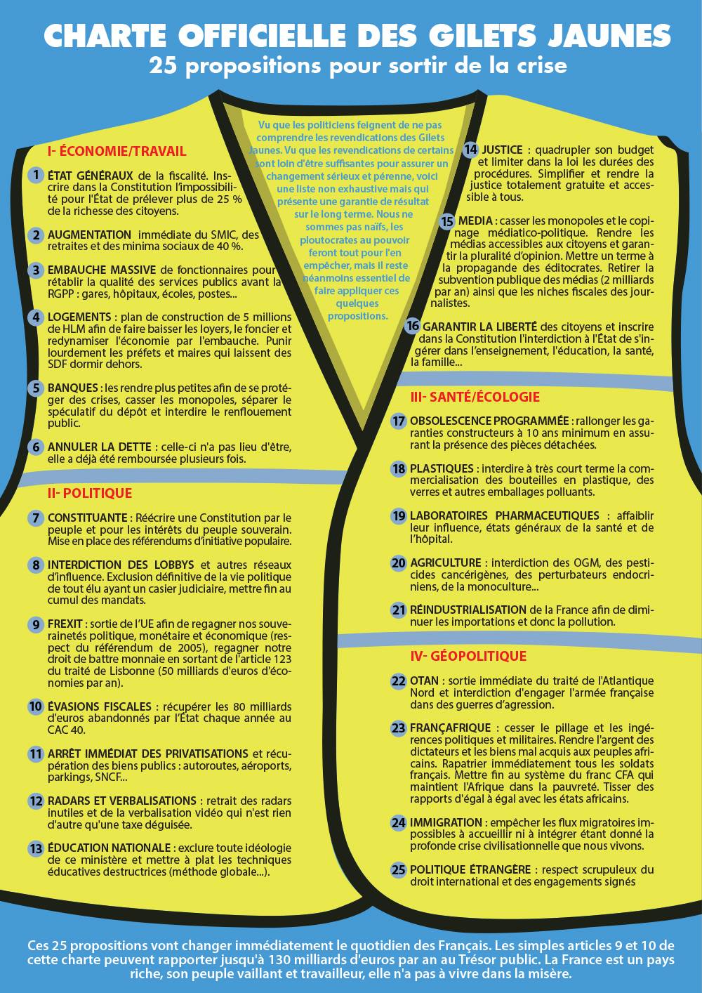 На четвертой неделе протестов появился некий список из 25 требований к правительству, который репостят в соцсетях. Опрошенные нами "жилетки" и французские журналисты говорят, что это неофициальный манифест, авторство его неизвестно.