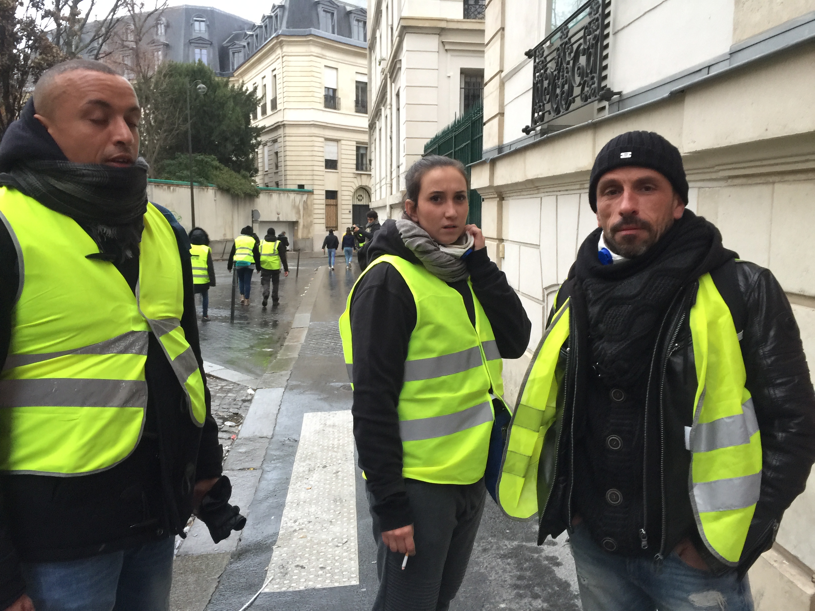 Протестный контингент – разношерстный. Большая часть – это молодые мужчины, работяги 20-40 лет. Мелькали и дамы, многие из которых просто пришли за компанию с бойфрендами и мужьями. На две трети это коренные французы, но есть и мигранты (арабы, темнокожие). В "желтожилетной" толпе попадались пестрые колоритные персонажи – дедушки в стиле хиппи с длинными бородами, ухоженные пожилые мадам субтильного телосложения с пирсингом, цепочками на лодыжках и в туфлях на каблуках на босу ногу (внешне из-за худощавости напоминают жену Макрона, 65-летнюю Бриджит), и просто старушки с сумками на колесиках, с которыми наши бабушки ходят на базар.