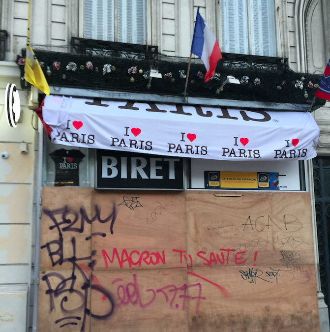 Выстроив вокруг себя крепость, Макрон, похоже, вызвал еще большую волну ненависти среди простого народа. В Париже его "склоняют" на каждому углу – в ушах стоит кричалка Macron démission ("Макрон демисьон" – Макрона в отставку). Стены домов и уличная реклама  расписаны лозунгами с неприкрытой агрессией по отношению к президенту – "Макрон харакири", "Елисейский дворец - сжечь", "Макрон – вор", "Макрона в тюрьму" (вспоминались наши "Бандитам тюрми" и "Злочинна влада").