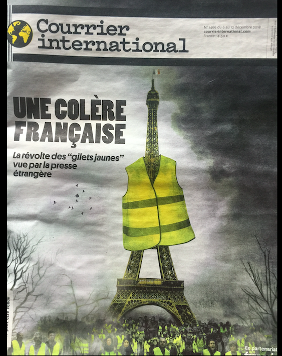 На обложке свежего выпуска французского журнала "Международный курьер" тему номера под заголовком "Французский гнев" проиллюстрировали одетой в желтый жилет Эйфелевой башней с протестующей толпой под главным символом Франции