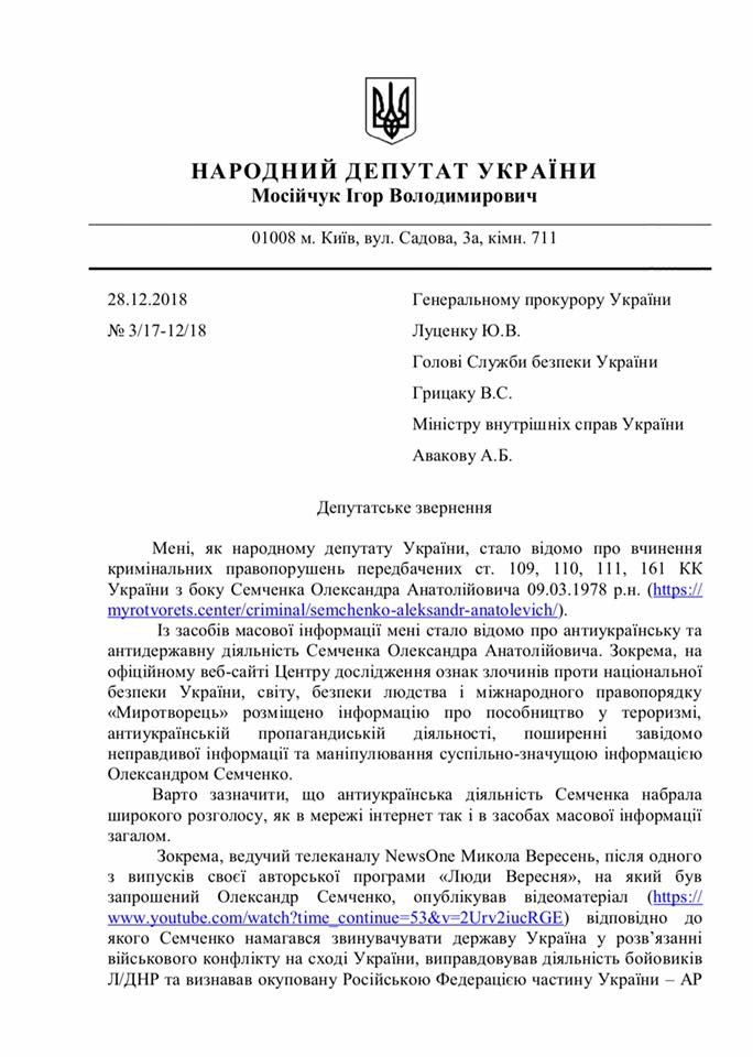 Так, 30 декабря Мосийчук на своей странице в Facebook обнародовал текст депутатского обращения, направленного им накануне в ГПУ, СБУ и МВД. В нем он потребовал привлечь Семченко к уголовной ответственности за госизмену (ст.111 УК Украины) и попытку совершения госпереворота (ст.109 УК Украины).