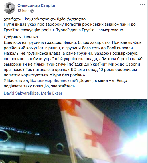 "Смотрю на грузин и завидую. Конечно, белой завистью. Приехал какой-то российский коммунист-верующий, а грузины его прочь в Россию выпихнули. К сожалению, не грузинские власти, а именно грузины. Завидую и размышляю: что должны сделать украинцы и украинская власть, чтобы хотя бы лет на 40 заморозить не только туристические поездки в Украину? Мы же в Европу стремимся? Так напомню: в странах ЕС уже более 10 лет особым спросом пользуются "Туры без русских". У Вас есть план, Владимир Зеленский?" - пишет Стариш в Facebook.