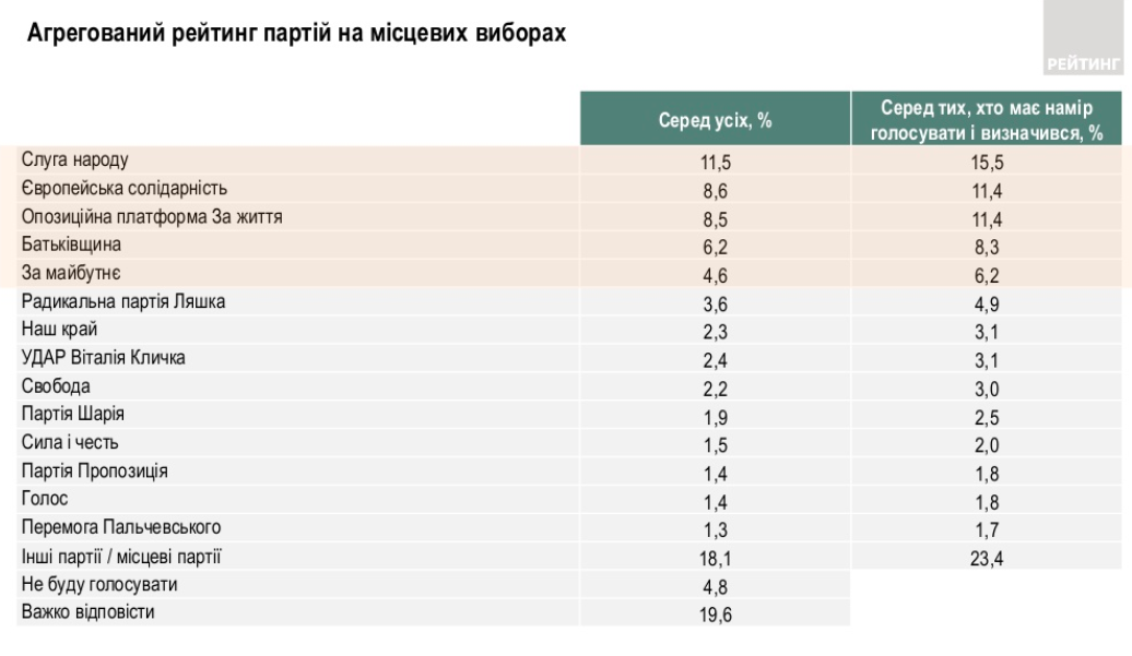 По результатам соцопроса, проведенного социологической группой "Рейтинг", во время которого было опрошено 5 тысяч человек, больше всего украинцев поддерживают партии "Слуга народа" (15,5%), "Оппозиционная платформа - За жизнь" (11,4%), "Евросолидарность" (11,4%), "Батькивщина" (8,3%),
