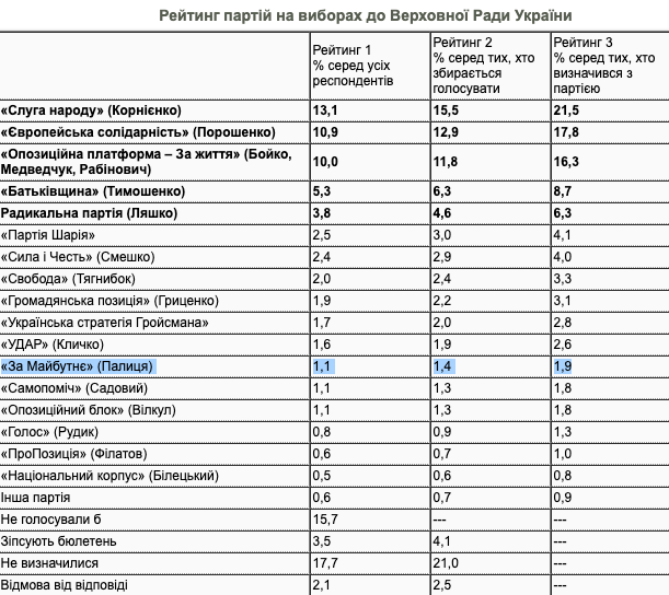 "Те данные, которые публикует "Рейтинг" - это, по сути, совокупность результатов отдельных опросов по местным советам. И там "За будущее" действительно демонстрирует в некоторых местах хороший результат за счет того, что под брендом партии идут представители местной элиты - мэры и просто известные люди. То есть это не рейтинг партии, а рейтинг тех кандидатов, которые идут на местные выборы под ее флагом. А когда спрашивают в общенациональных опросах отношение к партии, то рейтинг у нее гораздо ниже проходных 5%", - сказал "Стране" один из социологов.