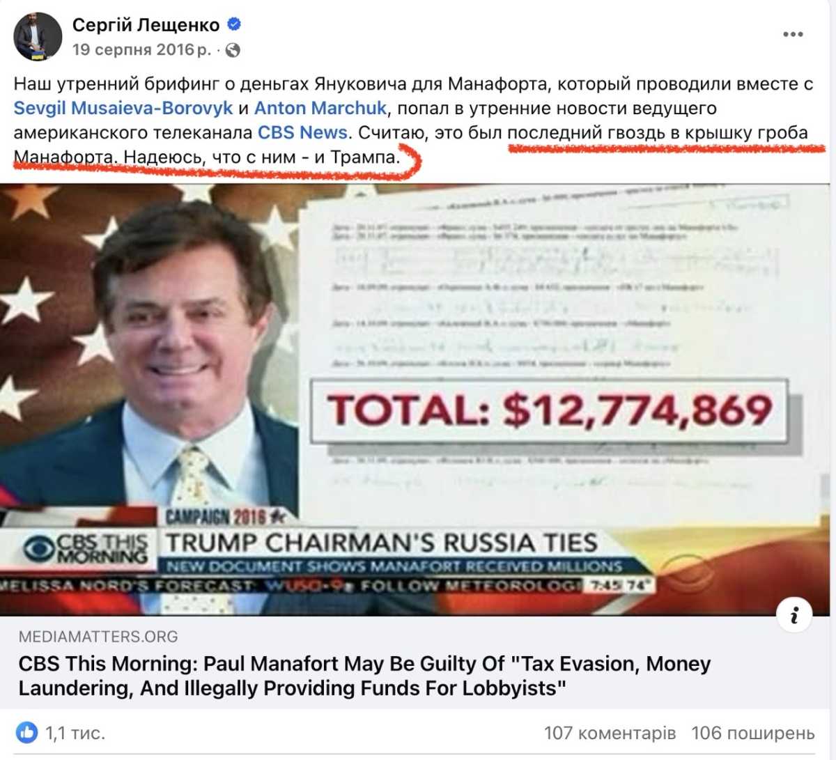 На специально созванной пресс-конференции он обнародовал свою часть скан-копий, полученных от анонимного источника. Это были страницы, где фигурировало имя Манафорта. "Амбарная книга Партии регионов" спасла мир", - писал Лещенко на своей странице в Facebook в августе 2016 года, утверждая, что компромат на Манафорта - это "последний гвоздь в крышку его гроба", а "вместе с ним - и Трампа".