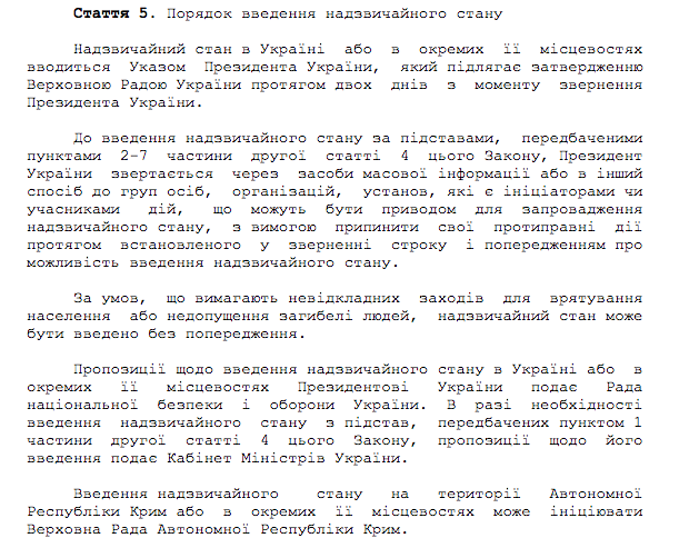 Чрезвычайное положение вводится президентом, но не единолично. Совет национальной безопасности и обороны может предложить главе государства ввести ЧП. После этого президент издает соответствующий указ, который должны большинством голосов поддержать народные депутаты, при чем строго в течение двух дней.