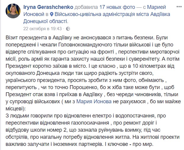 Вместе с этим, в обед воскресенья на сайте АП и аккаунтах в соцсетях главы государства, его пресс-секретаря Святослава Цеголко, 1-го вице-спикера Верховной Рады Ирины Геращенко, нардепа Марии Ионовой, волонтера Юрия Бирюкова появился целый ряд постов о совершенном Петром Алексеевичем визите в Донецкую область. А именно - в Авдеевку.
