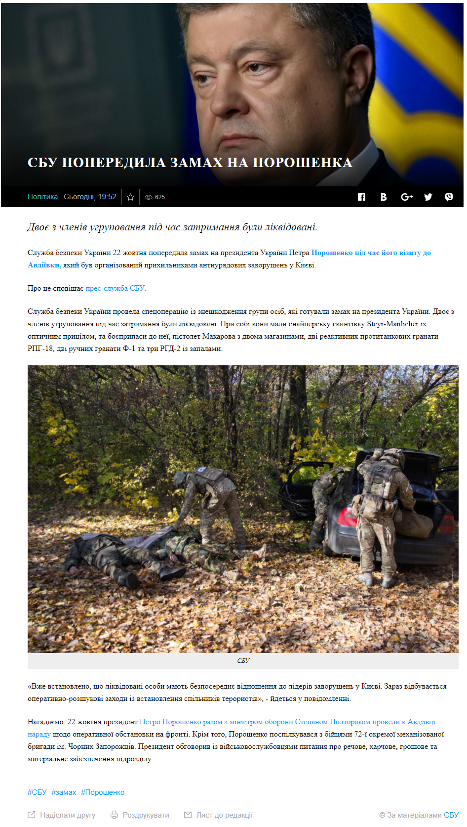 В нем указывалось, что группировка террористов планировала осуществить нападение во время поездки Порошенко в Авдеевку Донецкой области 22 октября. Но заговорщиков "накрыли" СБУшники. И в ходе спецоперации по задержанию членов бандформирования двух из них ликвидировали. Общее количество участников ОПГ в информации не конкретизировалось. Но фигурировали данные об изъятом у них арсенале.