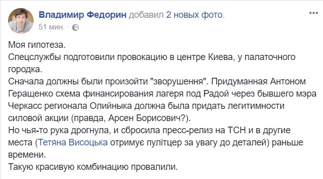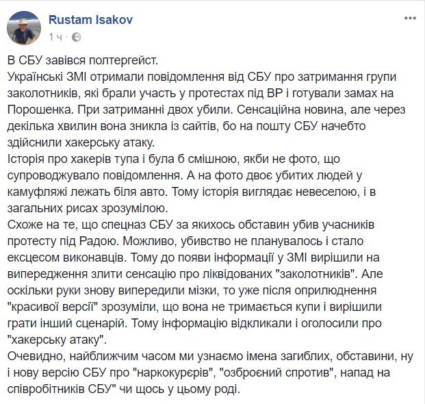 "Похоже на то, что спецназ СБУ по каким-то причинам убил участников протеста под Радой. Возможно, убийство не планировалось и стало эксцессом исполнителя. А потому до появления информации в СМИ решили на упреждение слить сенсацию о ликвидированных "заговорщиках". Но поскольку руки вновь опередили мозги, то уже после обнародования "красивой версии" поняли, что она не устоит, и решили разыграть другой сценарий. А потому информацию отозвали и объявили о "хакерской атаке", - рассуждает на своей странице в Facebook Рустам Исаков.