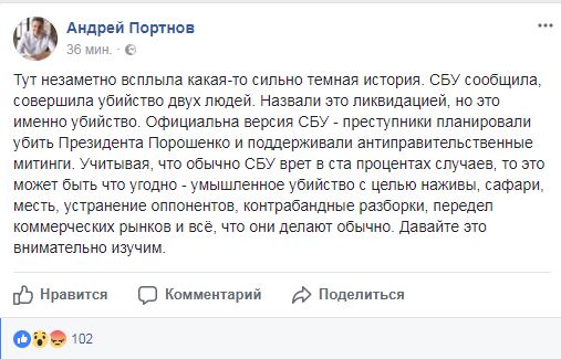 "Назвали это ликвидацией, но это именно убийство... Это может быть что угодно - умышленное убийство с целью наживы, сафари, месть, устранение оппонентов, контрабандные разборки, передел коммерческих рынков и всё, что они делают обычно", - написал Портнов.