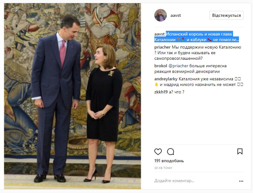 "Испанский король и новая глава Каталонии. И каблуки не помогли", – написал Венедиктов в Instagram