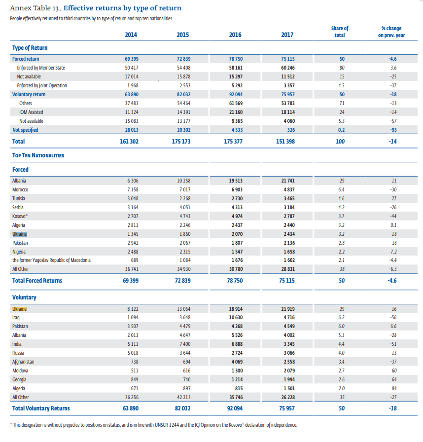 Украина - лидер по числу возвратов. 29 267 решений о депортации было принято в 2017 году по отношению к украинцам. К тому же, количество решений о возвратах в отношении украинцев с каждым годом растет. Из этих решений 24 356 фактически реализованы. По этому показателю мы занимаем второе место после Албании, которая также имеет безвизовый режим с Евросоюзом.