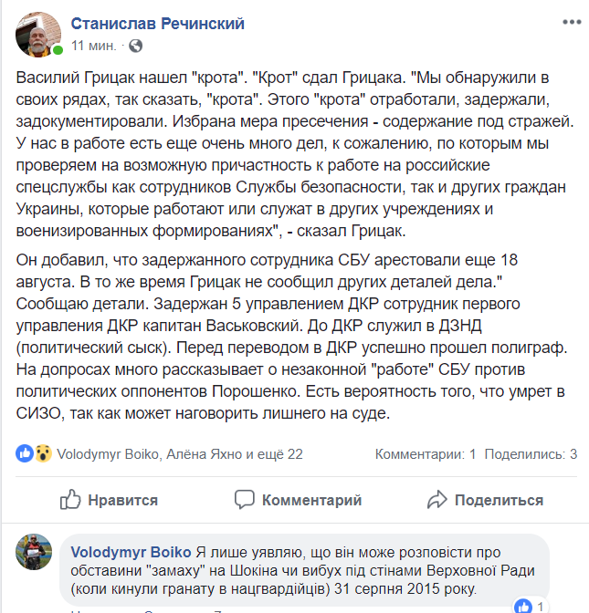 Следом за ним журналист Станислав Речинский на своей странице в Facebook сообщил ставшие известными ему подробности поимки "крота" в Департаменте контрразведки СБУ.