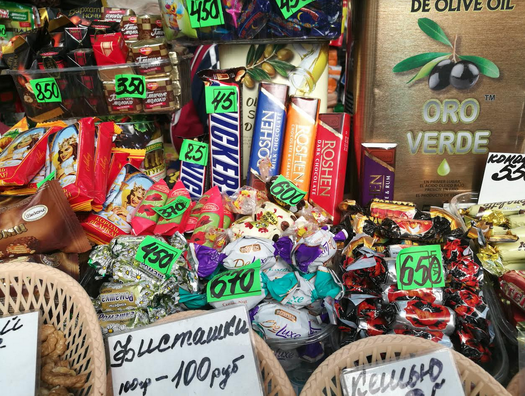 На одном из самых крупных рынков столицы Крыма "Куйбышевском" также есть конфеты от Порошенко. "Красный мак" - 770 рублей, "Коровка" - 440 рублей, "Кара-кум" -770 рублей, "Ромашка" - 520 рублей, шоколадный батончик "Roshen" - 35 рублей.