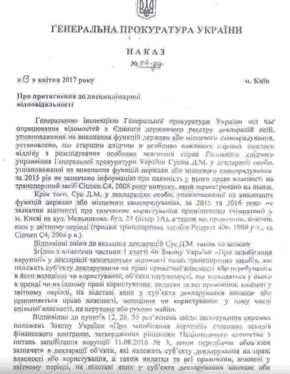 В ГПУ провели служебное расследование, по итогу которого генпрокурором Юрием Луценко был подписан приказ №12-дц от 12 ноября 2016 года о вынесении выговора Сусу за "нарушение порядка подачи декларации" и "предоставление недостоверных утверждений" в анкете добропорядочности прокурора.