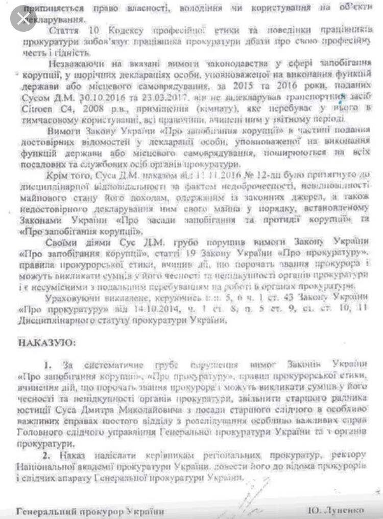 На своей странице в Facebook Сус обнародовал текст решения об этом, сопроводив комментарием в адрес бывших коллег по Генпрокуратуре и ее руководству.