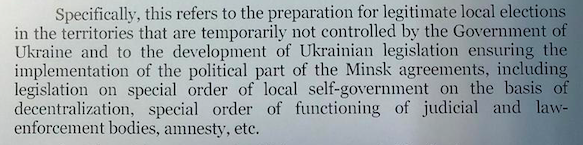 Одним из самых важных политических пунктов, о которых идет речь в письме Ермака, является обсуждение правовых аспектов особого порядка местного самоуправления. По словам главы ОП, Киев заранее предоставил свои предложения по внесению изменений в закон о порядке местного самоуправления и в проект закона о недопустимости преследования и наказания участников событий в Донецкой и Луганской областях (то есть амнистии).