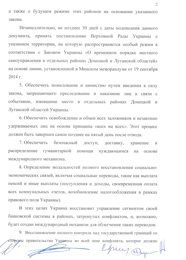 В документе был уточнен и расширен список мероприятий, предусмотренных "Минском-1". Также в "Комплекс мер" была добавлена политическая часть. Она предусматривала особый статус отдельных районов Донбасса, проведение там выборов по украинским законам, амнистию участникам конфликта и т.д.