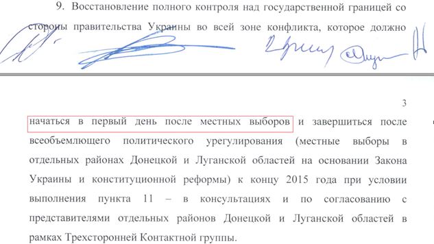 Ключевая проблема в том, что, согласно пункту 9 соглашения, восстановление полного контроля над государственной границей Украины должно начаться в первый день после местных выборов. А завершиться передача контроля над границей должна после всеобъемлющего политического урегулирования, которое включает в себя внесение особого статуса Донбасса в Конституцию: