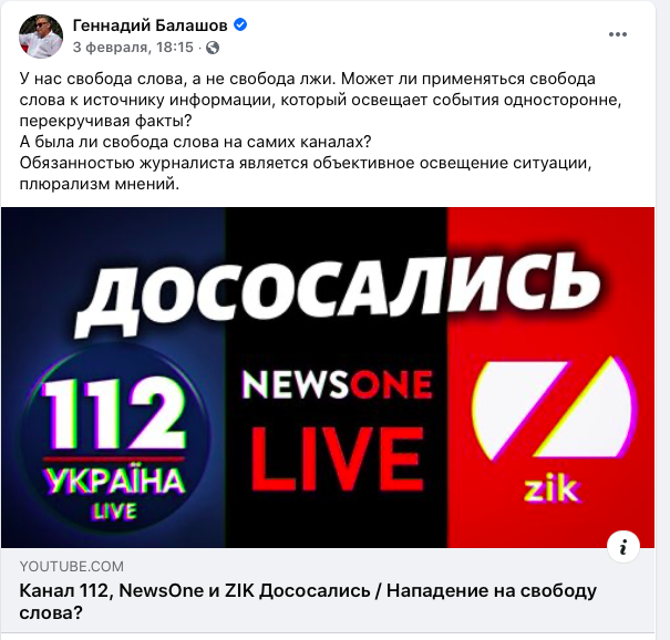Вот еще несколько его цитат: "У нас свобода слова, а не свобода лжи. Может ли применяться свобода слова к источнику информации, который освещает события односторонне, перекручивая факты? А была ли свобода слова на самих каналах? Обязанностью журналиста является объективное освещение ситуации, плюрализм мнений", - написал Балашов. И прикрепил ссылку на свой видеоблог, озаглавленный: "Канал 112, NewsOne и ZIK Дососались".