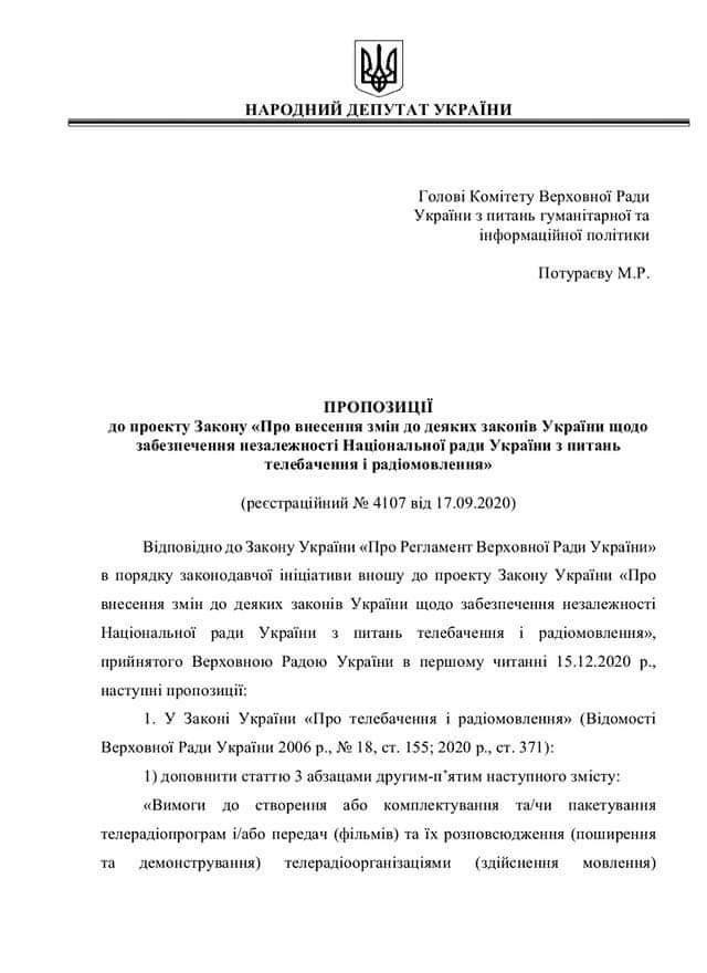 Его авторами являются депутаты от "Слуги народа" Евгения Кравчук и Никита Потураев. В проекте №5554 они предложили отсрочить норму из-за "негативного влияния карантина на деятельность теле- и кинопроизводителей" таким образом, чтобы она вступила в силу через 2 месяца после окончания карантина (который пока регулярно продлевают). Но дать ход этому документу не получилось. Депутаты не проголосовали за включение его в повестку дня на предыдущей пленарной неделе, а это значит, что практически невозможно принять его, пройдя по полной процедуре, до 16 июля.