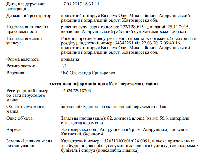 Дом и участок 5 соток перешли в собственность Александра Чуба на основании решения Андрушевского райсуда, которое принял вышеупомянутый судья Виктор Брагин. Это указано в реестре недвижимости, выписку из которого получила "Страна":