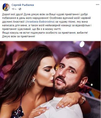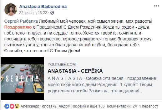 "Любимый мой человек, мой смысл жизни, моя радость! Поздравляю с Праздником! С Днем Рождения! Когда ты рядом - душа поёт, тело танцует, а на сердце тепло. Хочется творить, сочинять и посвящать тебе творчество, которое рождается только благодаря этому пылкому чувству, только благодаря нашей любви, благодаря тебе. Спасибо, что ты есть! С Твоим Днём!", - написала Анастасия и приложила видео на песню, которую посвятила Рыбалке.