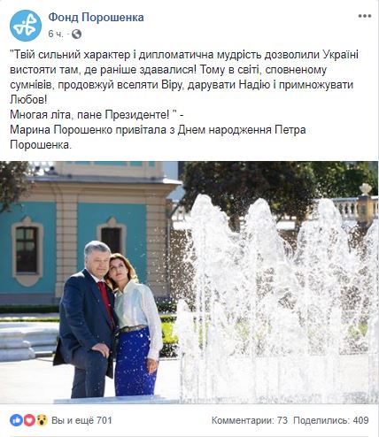 Около девяти утра сегодня появился пост с поздравлениями от первой леди. Так как у жены президента Марины Порошенко нет профиля в социальной сети, она поздравила супруга с официального аккаунта "Фонда Порошенко" в Facebook.