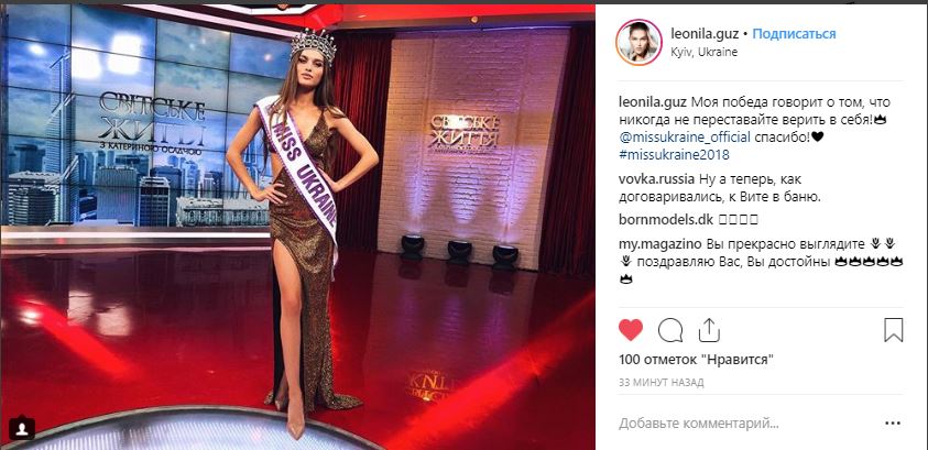 Именно под этим фото, помимо поздравлений появились и язвительные комментарии типа, "Ни о чем. Мисс Украина, разочарование", "Экспертов - на мыло". Многие пишут, что до титула самой красивой украинки Леониле еще очень далеко: "Проплаченная мисс! До этого в тройку не вошла , а тут внезапно стала мисс?! Ходить не умеет, недалекая, ниже всех, ценностей нет... позор комитету. Вот честно, нет слов".