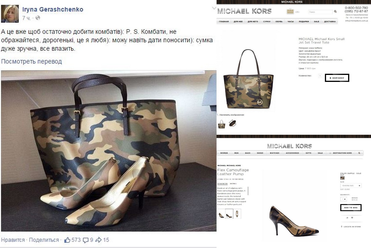 К слову, это пара обуви и сумочка от американского бренда Michael Kors. На то время (2015 год) - сумка Геращенко стоила 7905 грн, а туфли - $99 (по скидке - $49,5).
