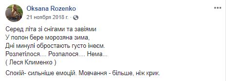 Также тут есть грустные стихи. А после четверостишья украинской писательницы Леси Клименко, сама Оксана добавляет: "Спокойствие - сильнее эмоций. Молчание - больше, чем крик".