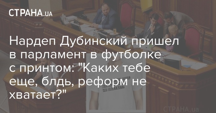 Сегодня на очередное заседание украинского парламента народный депутат Александр Дубинский (СН) пришел в джинсах, кроссовках и футболке с неоднозначным принтом. На груди у 38-летнего народного депутата было написано "Каких тебе еще, блдь, реформ не хватает?"