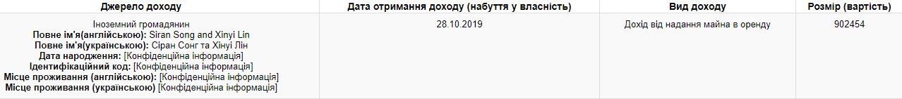 Согласно уточнению, 28 октября Зе получил 902 454 грн от сдачи имущества в аренду иностранным гражданам с именами Сиран Сонг и Хинуи Лин. В то же время, в электронной декларации не указано, что именно сдавал президент в аренду за такую сумму.