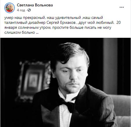 Вчера, 20 января, стало известно о смерти Сергея Ермакова, популярного на весь мир украинского дизайнера. О печальном событии сообщила у себя в социальной сети Facebook художница Анжелика Рудницкая.