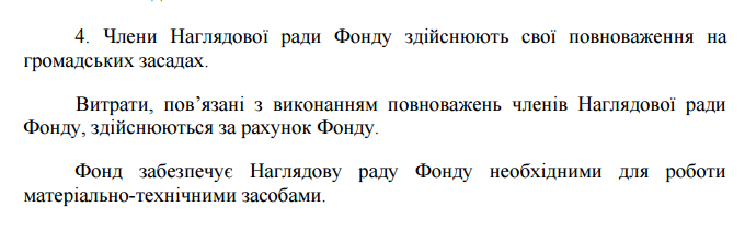 По сути, наблюдательный совет, который возглавляет Марина Порошенко, выполняет организационно-распорядительные функции. Свои функции члены наблюдательного совета выполняют на общественных началах. Правда, фонд должен им компенсировать расходы, связанные с ведением их деятельности: