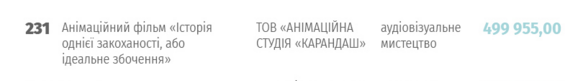 Также полмиллиона получил мультфильм "История одной влюбленности или Идеальное извращение", которое должна выпустить анимационная студия "Карандаш":