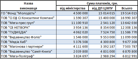 "Страна" собрала информацию о десятке крупнейших получателей денег из бюджета, которым платили одновременно Минстець и ЦЗИПУ. В 2018 году они получали многомиллионные платежи за различные "рекламно-творческие" проекты: