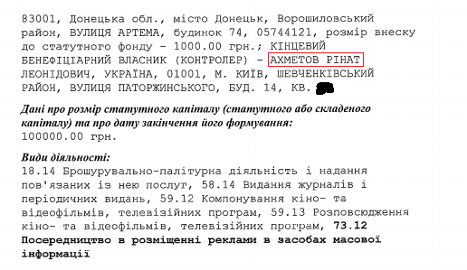 Согласно сведениям реестра юридических лиц, получившее 19,4 млн грн рекламное агентство входит в состав ТРК "Украина", а его бенефициаром (конечным владельцем) указан самый богатый украинский олигарх Ринат Ахметов: