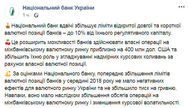 Согласно оценкам Нацбанка, предыдущее увеличение лимитов валютной позиции банков в середине 2018 года не имело негативного эффекта для валютного рынка Украины. Кроме того, в результате не увеличилось давление на гривню. Напротив, мера привела к увеличению объемов операций на межбанковском валютном рынке и уменьшению курсовой волатильности.