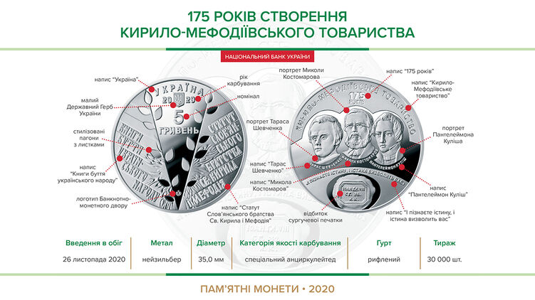 Национальный банк Украины с 26 ноября введет в обращение новую памятную монету "175 лет создания Кирилло-Мефодиевского общества" номиналом 5 гривен.