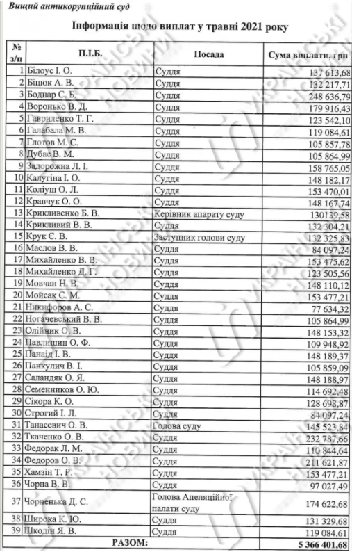 Судья Инна Билоус за май получила 137 613 гривен зарплаты, Андрей Бицюк - 132 217 гривен, Сергей Боднар - 248 636 гривен, Владимир Воронько - 179 916 гривен, Татьяна Гавриленко - 123 542 гривны, Маркиян Галабала - 119 084 гривны, Николай Глотов - 105 857 гривен, Виталий Дубас - 105 864 гривны, Лариса Задорожная - 158 765 гривен, Инна Калугина - 148 182 гривны, Олег Колиуш - 153 470 гривен, Алексей Кравчук - 148 167 гривен, Виталий Крикливый - 132 304 гривны, Виктор Маслов - 84 097 гривен, Вера Михайленко - 153 475 гривен, Дмитрий Михайленко - 123 505 гривен, Наталья Мовчан - 148 110 гривен, Сергей Мойсак - 153 477 гривен, Андрей Никифоров - 77 634 гривны, Виктор Ногачевский - 105 864 гривны, Оксана Олейник - 148 153 гривны, Олег Павлишин - 109 948 гривен, Игорь Панаид - 148 189 гривен, Виктор Панкулич - 105 859 гривен, Ольга Саландяк - 148 188 гривен, Александр Семенников - 114 692 гривны, Екатерина Сикора - 128 698 гривен, Игорь Строгий - 84 097 гривен, Олег Ткаченко - 232 787 гривен, Леся Федорак - 110 844 гривны, Олег Федоров - 211 621 гривну, Тимур Хамзин - 153 477 гривен, Валерия Черная - 97 027 гривен, Екатерина Широкая - 131 329 гривен, Ярослав Шкодин - 119 084 гривны.