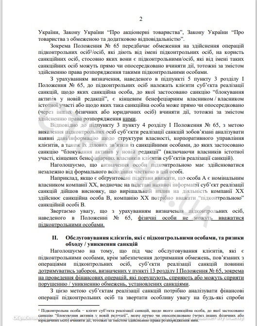 Этот документ посвящен операциям "подконтрольных лиц". К таким лицам регулятор относит только субъектов хозяйствования - не физлиц, а только бизнес. Который, по мнению банков, может иметь связь или поддерживать отношения с подсанкционными лицами. Чиновники считают, что контроль за ними нужен, чтобы подсанкционники не могли использовать эти компании для своих целей - чтобы продолжать пользоваться банковским услугами в обход санкций.