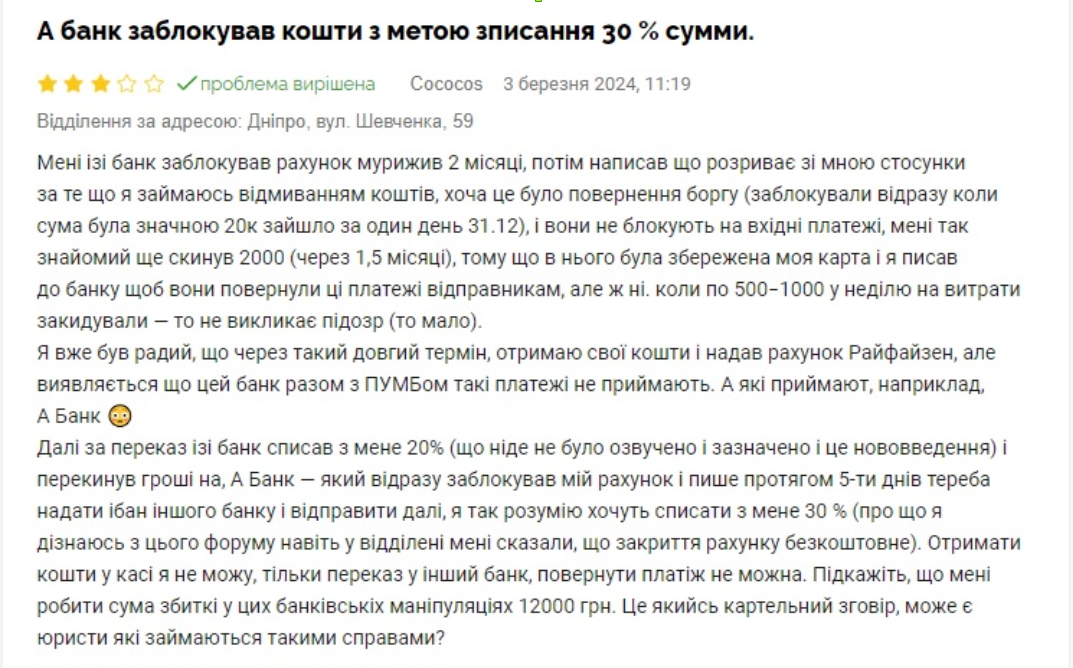 "За перевод IZI Bank (работает по лицензии ТАСкомбанка - "Страна") списал с меня 20% (что нигде не было озвучено и это нововведение) и перебросил деньги на Абанк, который сразу заблокировал мой счет и написал, что на протяжении пяти дней нужно предоставить IBAN другого банка и отправить дальше. Я так понимаю, хотят списать 30%. Получить деньги в кассе я не могу, только перевод в другой банк, вернуть платеж нельзя. Сумма убытков в этих банковских манипуляциях 12 000 грн. Это какой-то картельный сговор", - говорится в жалобе клиента Абанка из Днепра.