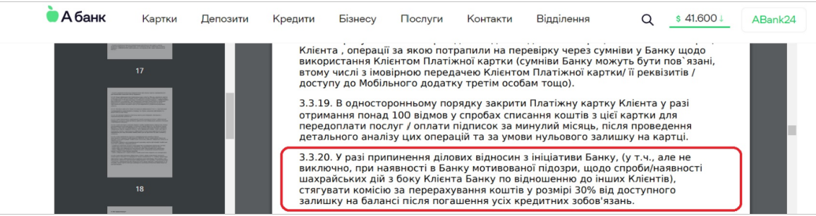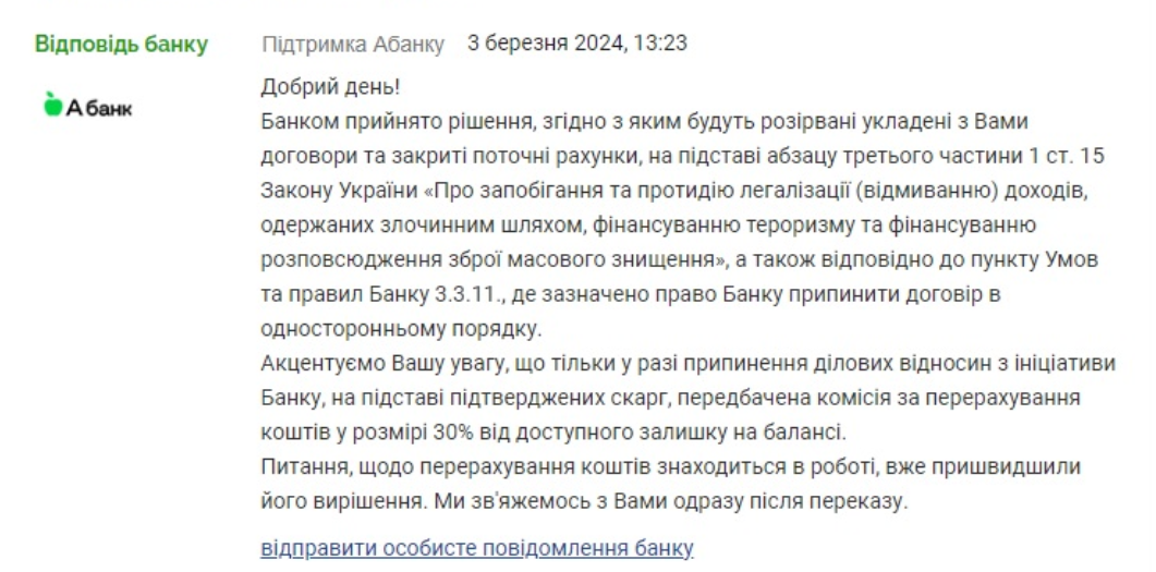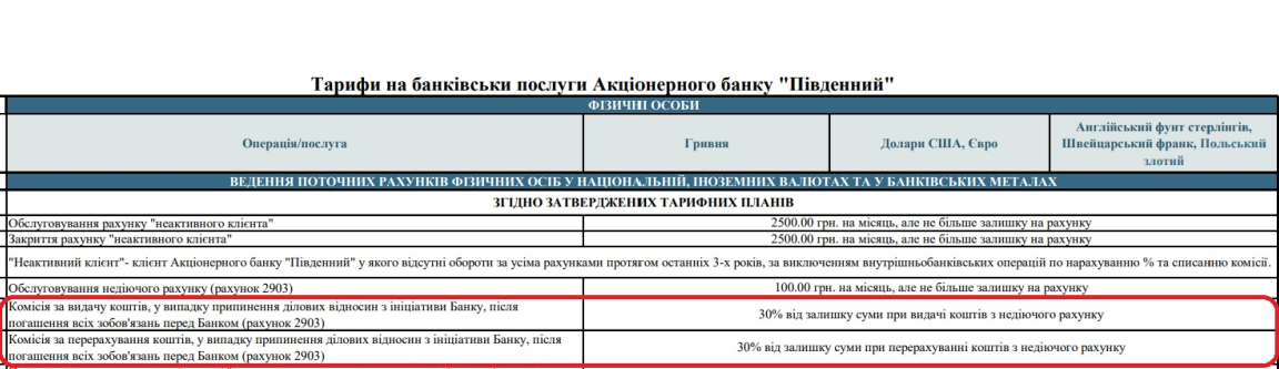 Комиссии за выдачу/перечисление средств при принудительном закрытии счета после нарушения правил финансового мониторинга официально прописаны в договорах некоторых банков. В том числе Абанка и Банка Пивденный, на который жалуются люди. У обоих банков размер комиссии составляет 30%, и это указано в документах на официальных сайтах структур.