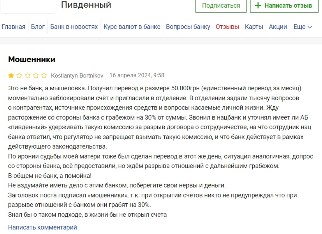 "Это не банк, а мышеловка. Получил перевод в размере 50 000 (единственный перевод за месяц), моментально заблокировали счет и пригласили в отделение. В отделении задали тысячу вопросов о контрагентах, источнике происхождении средств и вопросы, касаемые моей личной жизни. Жду расторжение со стороны банка с грабежом на 30% от суммы", - написал в своей жалобе Константин Бортников.